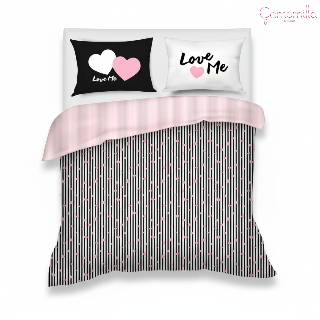 Il Completo CopriPiumino Matrimoniale LOVE ME by Camomilla Home è composto da un sacco 250x200cm+RIMBOCCO, due federe 50x80cm a sacco e un lenzuolo inferiore con angoli 180x200cm.