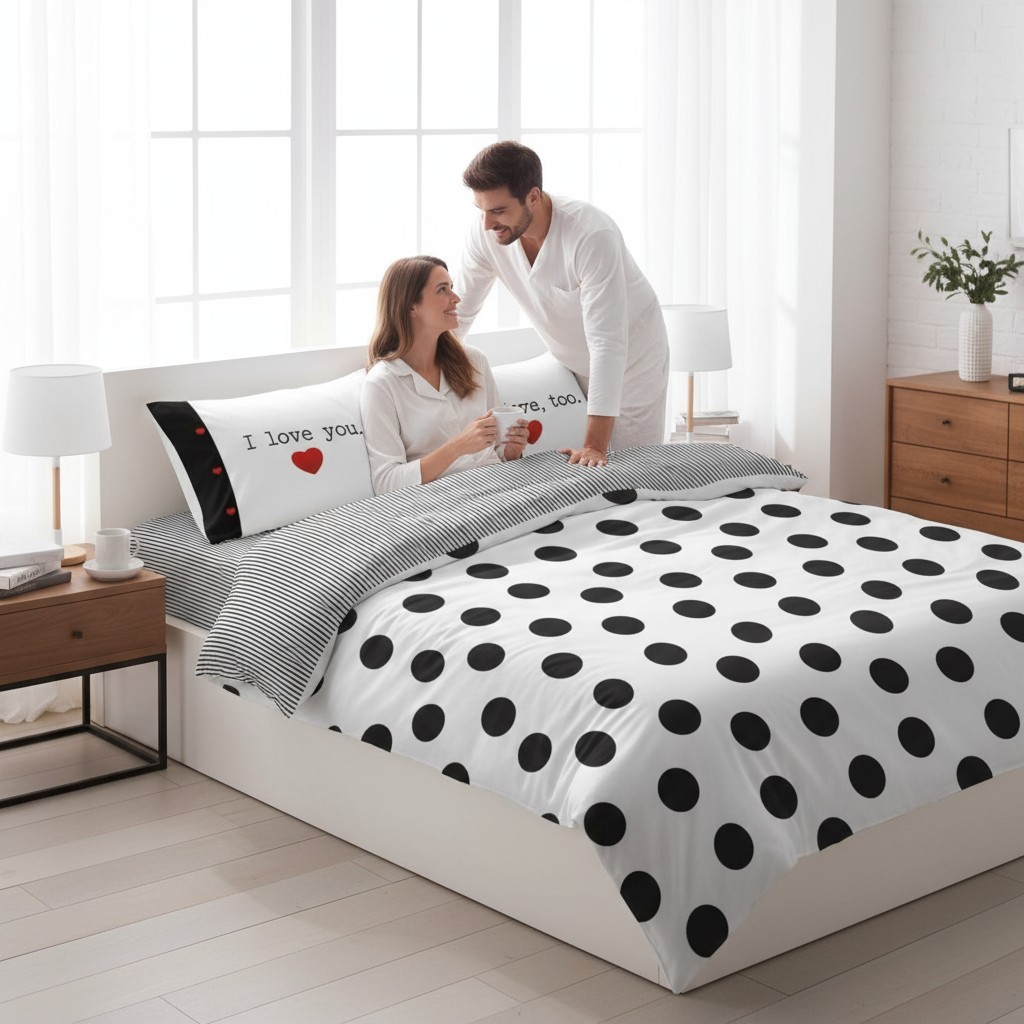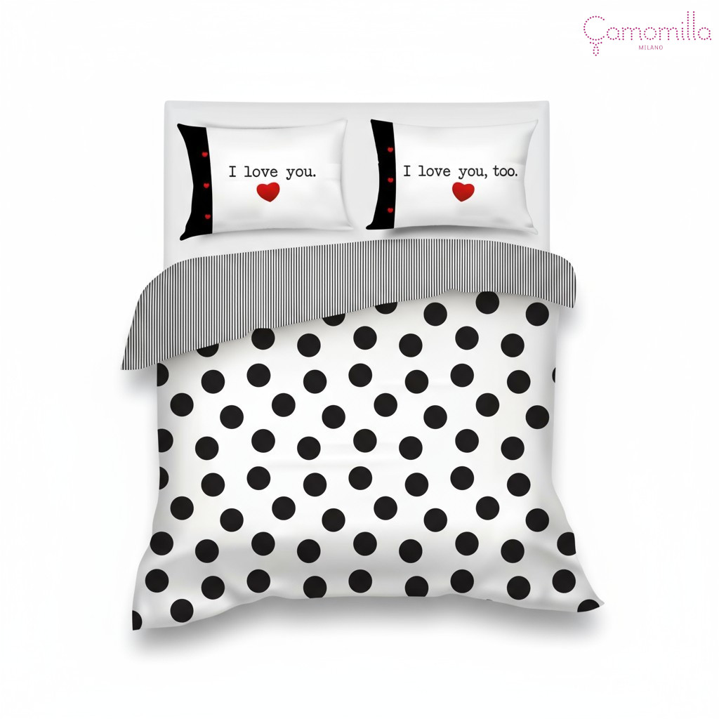 Il Completo CopriPiumino Matrimoniale MON AMOUR by Camomilla Home è composto da un sacco 250x200cm+RIMBOCCO, due federe 50x80cm a sacco e un lenzuolo inferiore con angoli 180x200cm.
