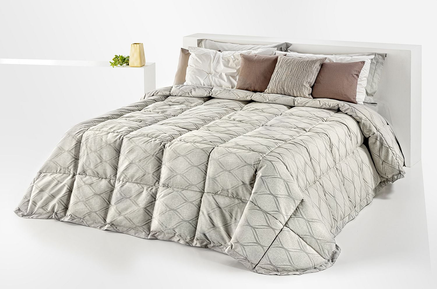 Imbottitura in piumino BASIC (90% Fiocco di piumino pregiato – 10% Piumette) e trapuntatura a quadri 30×30 circa, angoli ai piedi arrotondati.
