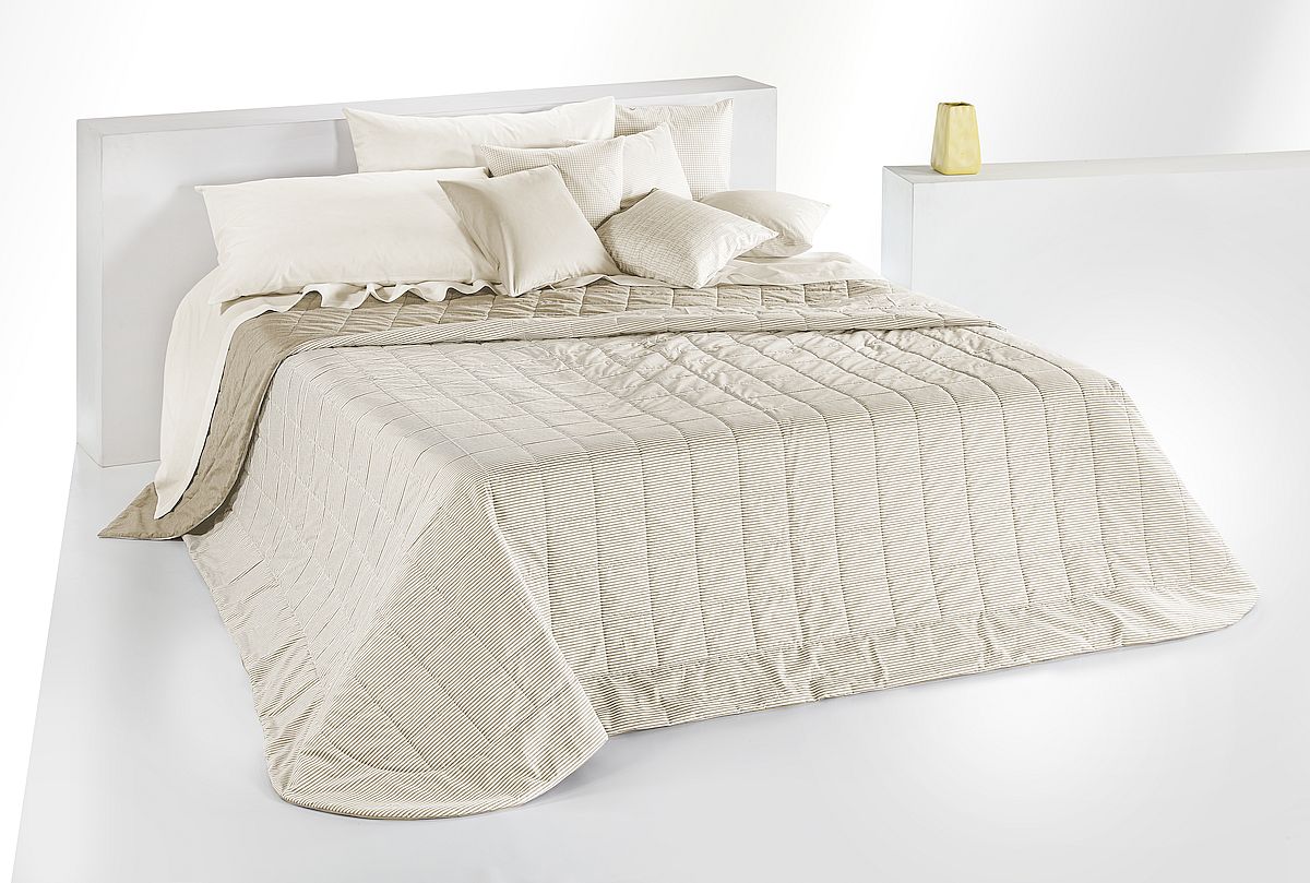 Leggerissima Trapunta estiva realizzata con altissima qualità artigianale, con tessuto superiore 100% cotone filotinto e uno speciale puro cotone 100% tinta unita in quello inferiore.