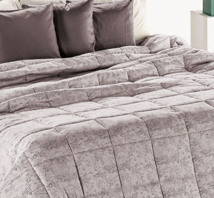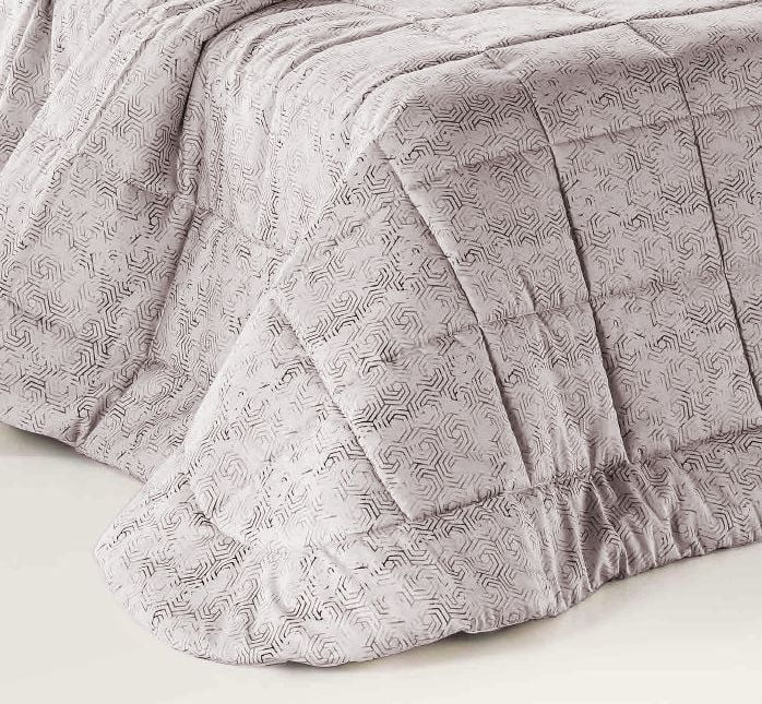 Leggerissima Trapunta estiva-primaverile realizzata con altissima qualità artigianale, con tessuto superiore in fantasia 100% raso di cotone e uno speciale puro cotone 100% tinta unita a tenuta di piuma per quello inferiore.