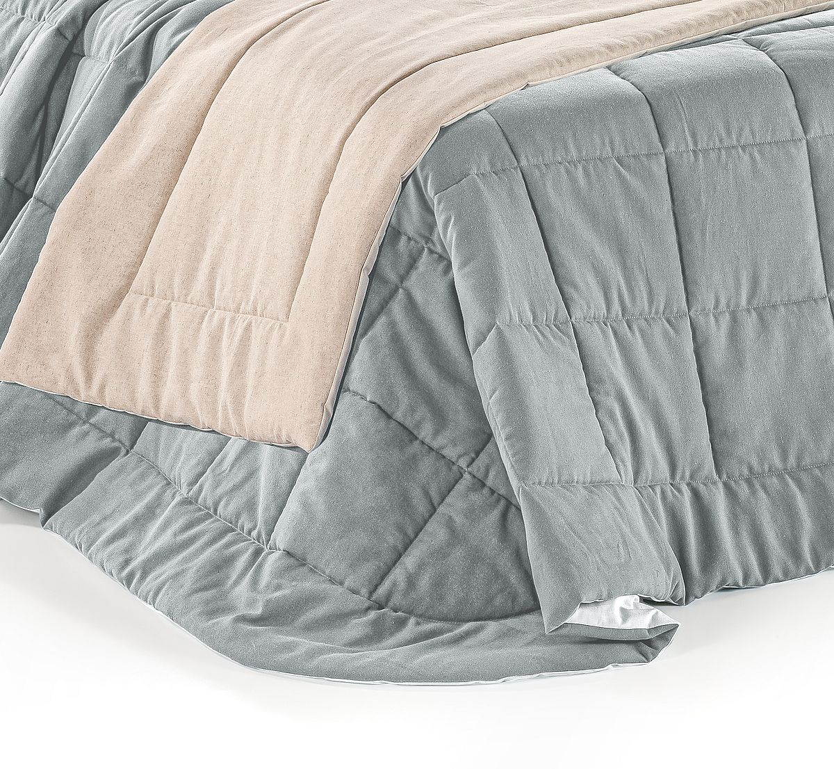 Leggerissima Trapunta estiva-primaverile realizzata con altissima qualità artigianale, con tessuto superiore in tinta unita e uno speciale puro cotone 100% tinta unita a tenuta di piuma per quello inferiore.