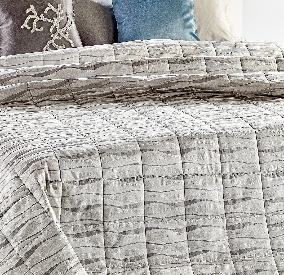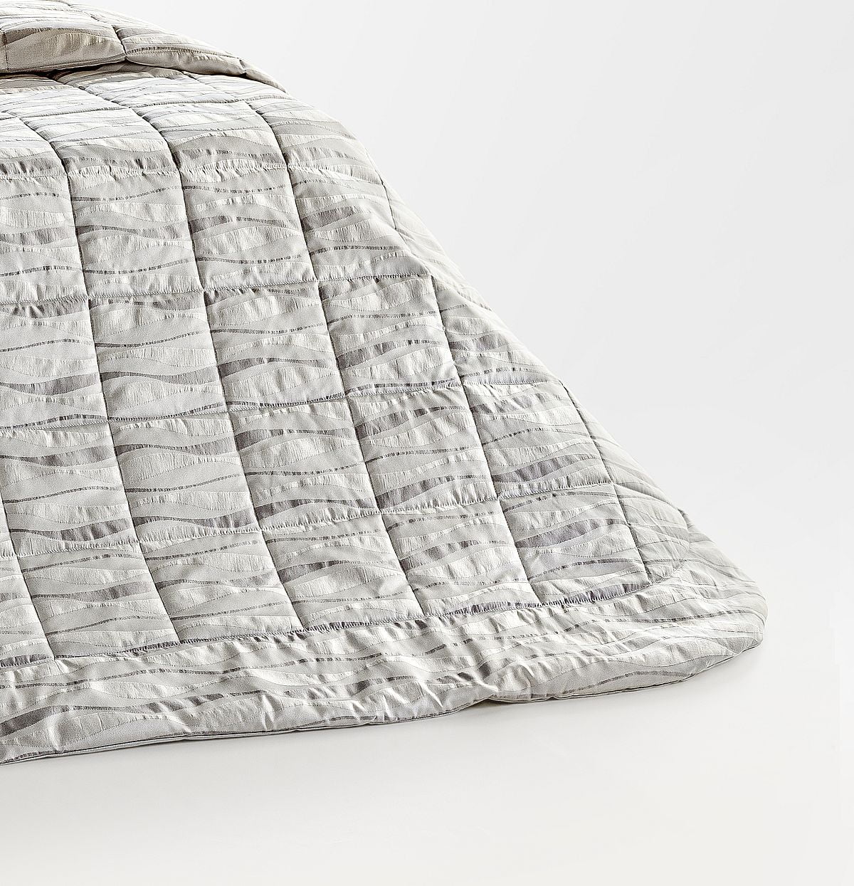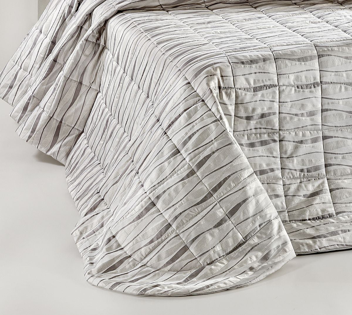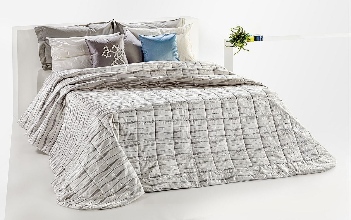 Leggerissima Trapunta estiva-primaverile realizzata con altissima qualità artigianale, con tessuto superiore in fantasia e uno speciale puro cotone 100% tinta unita a tenuta di piuma per quello inferiore.